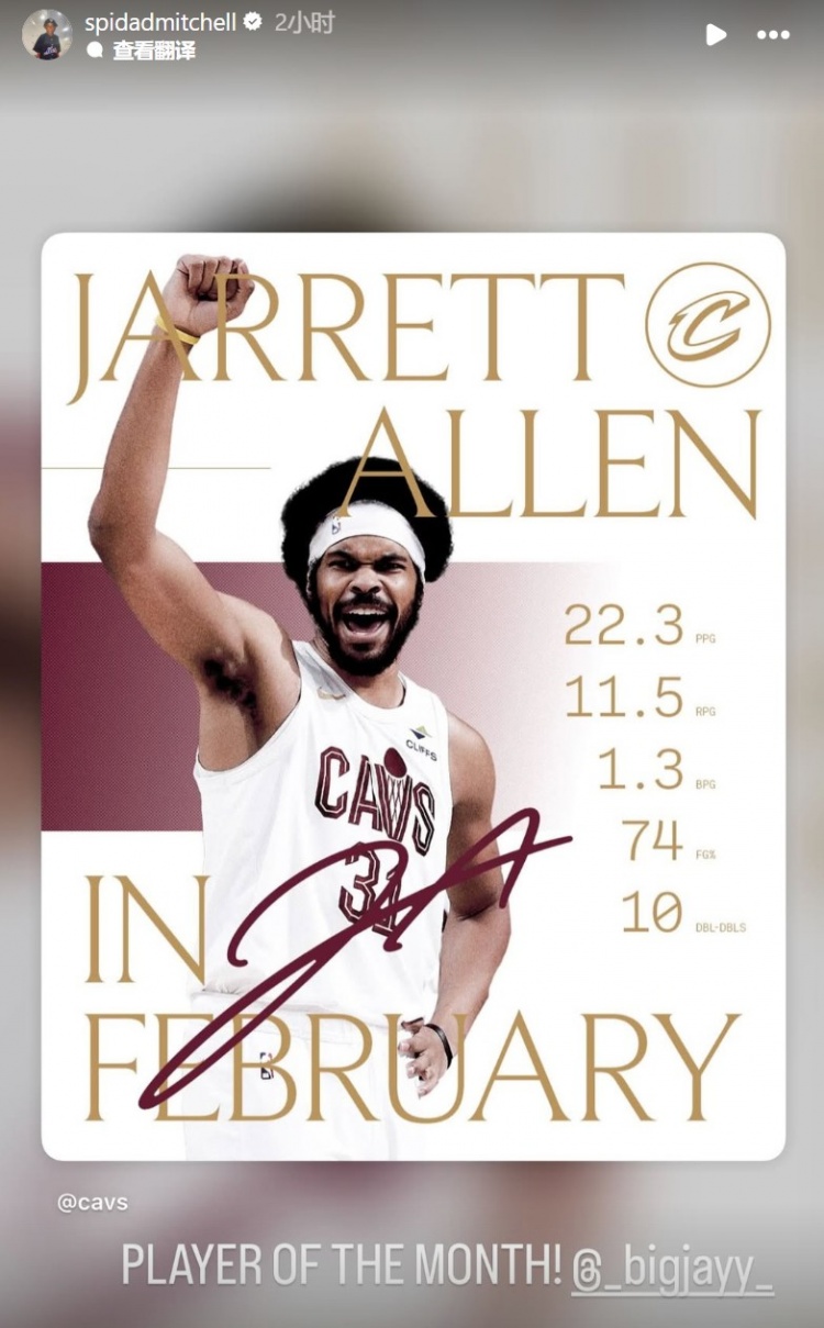 爱游戏ayx-贾勒特·阿伦二月场均22.3分11.5板&命中率74% 米切尔:月最佳 xiaoqiao 2026年03月17日 01:29 40 0 3月1日讯 今天,骑士官方晒出了贾勒特·阿伦二月份的数据,场均能得到22.3分11.5篮板1.3盖帽,投篮命中率74%,得到10次两双。队友米切尔转发评论道:“月最佳球员。”
